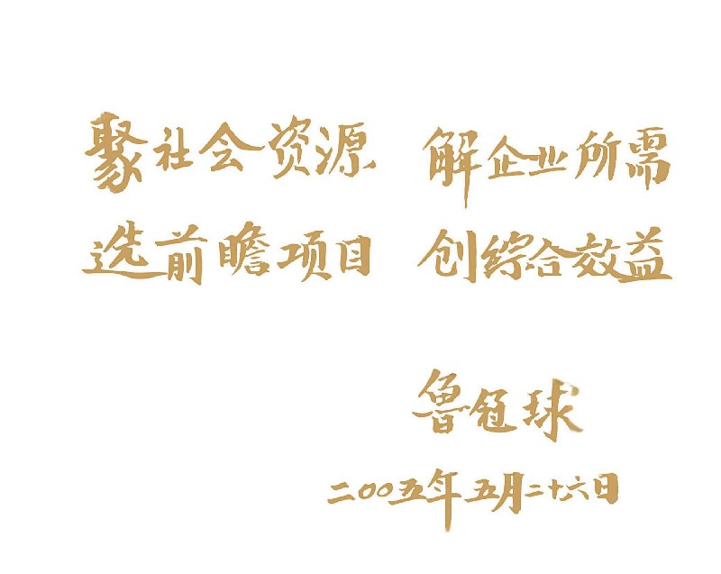2005年5月26日,恰逢公司乔迁,万向创始人鲁冠球欣然提笔,为公司书写“聚社会资源,解企业所需,选前瞻项目,创综合效益”的寄语。